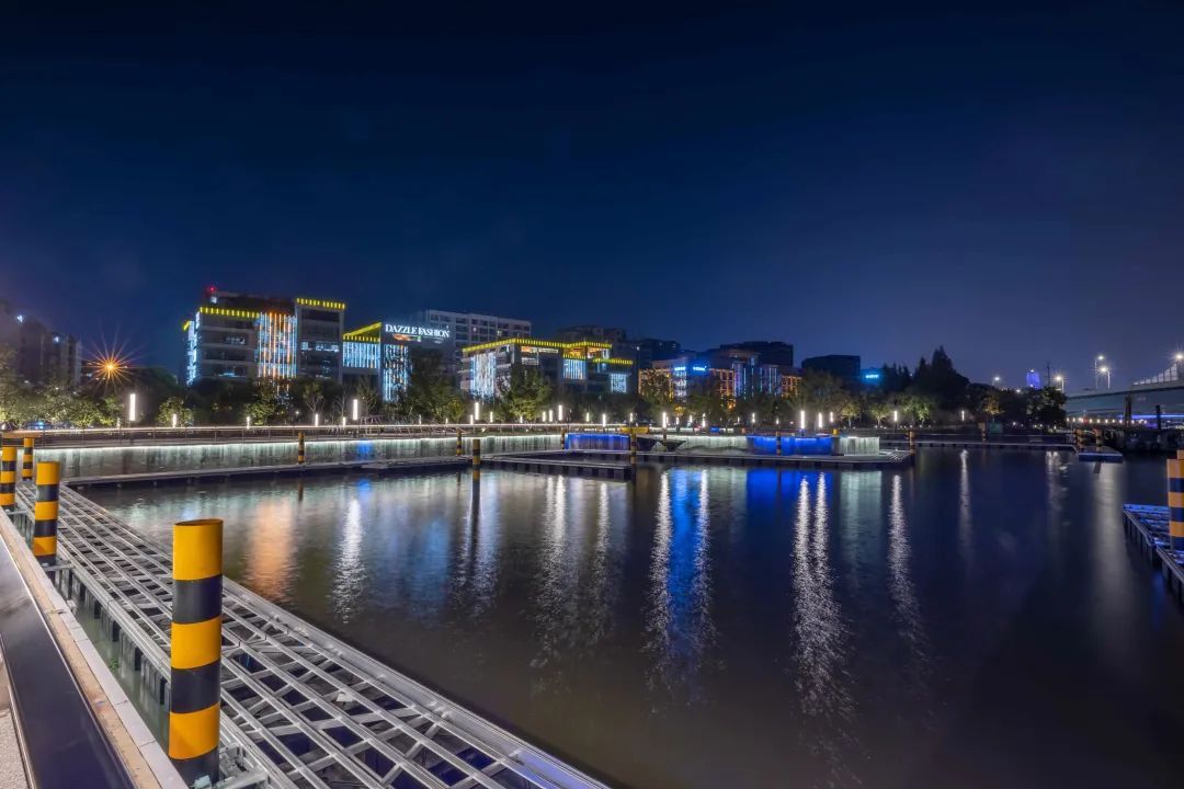 沿着丹巴路向南,便是丹巴路码头,夜景灯光将码头岸线立面印染得绚丽多彩。