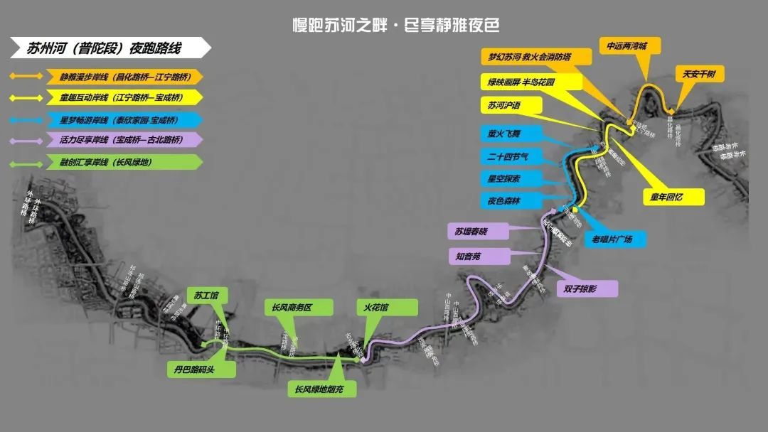 苏州河普陀段岸线全长21公里,占中心城区岸线长度的50%,正好是半程马拉松的距离,两岸历史工业遗存、特色建筑桥梁等是一笔丰富的文化资源。随着苏州河普陀段两岸公共空间的贯通和开放,空间品质不断提高,不仅白天的景观面貌显著改善,晚上的灯光夜景也在不断提升,一条品读苏河夜色的夜跑路线悄然呈现。