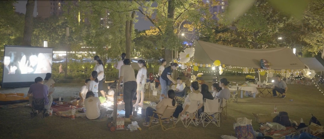 跑进公园深处,人们在草坪上搭起帐篷和电影幕布,在这里歇一会儿,和伙伴们聊聊天。
