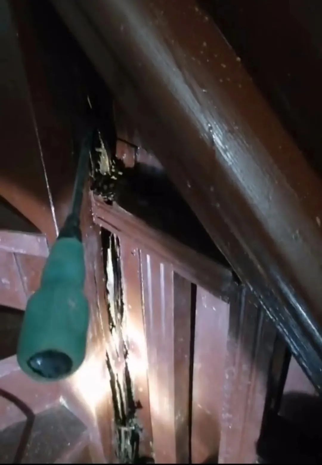 虹口区房屋急修中心工作人员经过现场查看,在检查楼梯间木质栏杆后,看到了白蚁活动的痕迹,顺着蚁路查到了家白蚁的蚁道。工作人员根据多年的灭害经验判断,此处栏杆已被白蚁侵害。