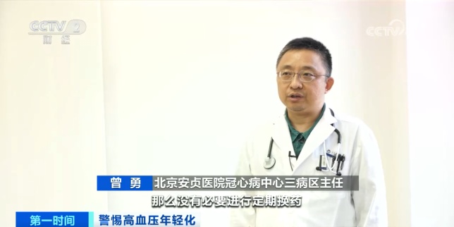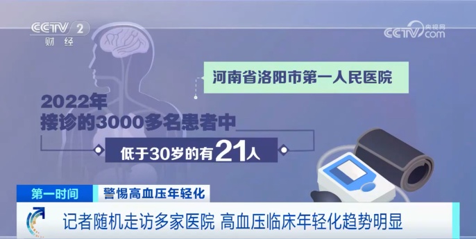 总台记者随机走访了北京、江苏、河南三所医院的高血压门诊发现:河南省洛阳市第一人民医院,2022年接诊的3000多名患者中,低于30岁的有21人;江苏省中医院,35岁以下患者占比从2021年的1.16%,上升到今年的2.15%;北京安贞医院的数据则显示,70%的门诊患者,为中青年群体。