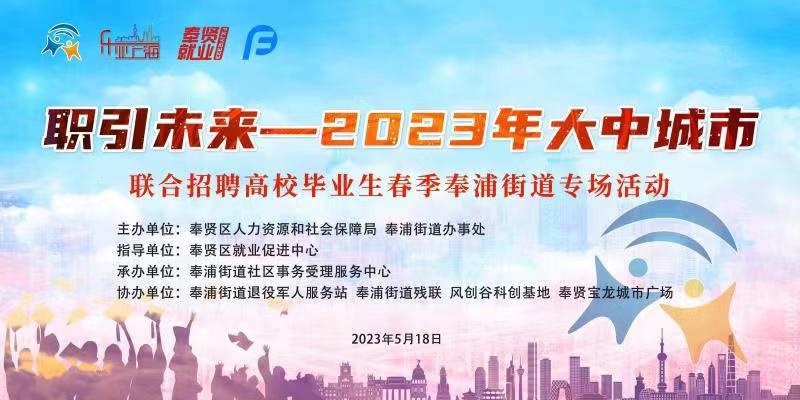 5月18日下午,由奉贤区人力资源和社会保障局、奉浦街道办事处主办,奉浦街道社区事务受理服务中心承办,奉浦街道退役军人服务站、奉浦街道残联、凤创谷科创基地和奉贤宝龙城市广场协办的“职引未来——2023年大中城市联合招聘高校毕业生春季奉浦街道专场活动”在宝龙城市广场拉开序幕。