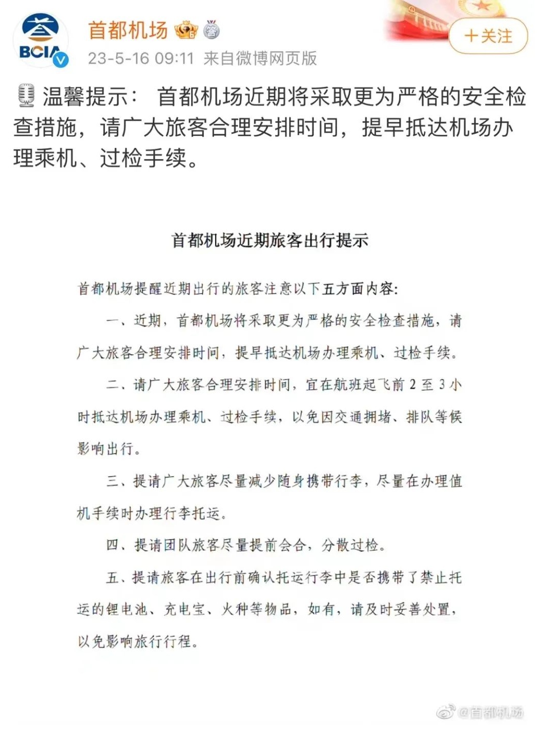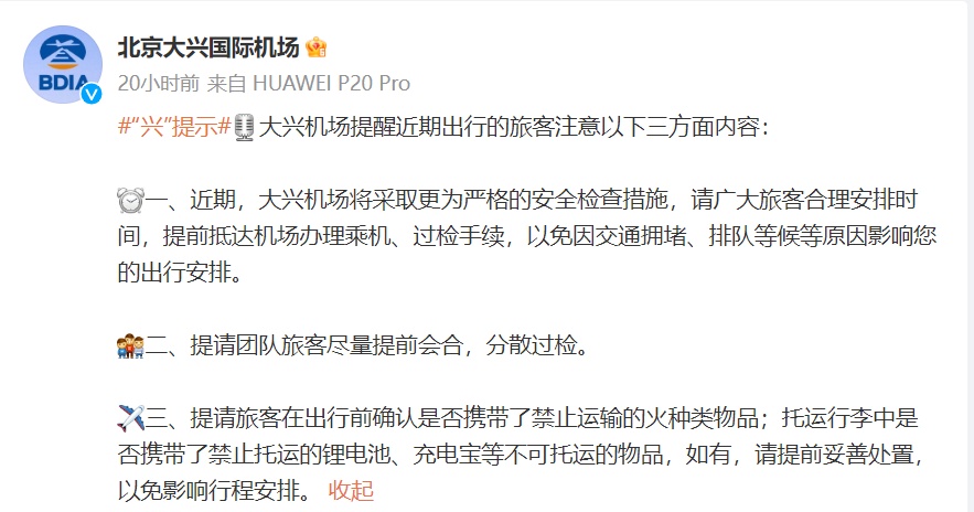 大兴机场也提醒道,近期,大兴机场将采取更为严格的安全检查措施,请广大旅客合理安排时间,提前抵达机场办理乘机、过检手续,以免因交通拥堵、排队等候等原因影响您的出行安排。
