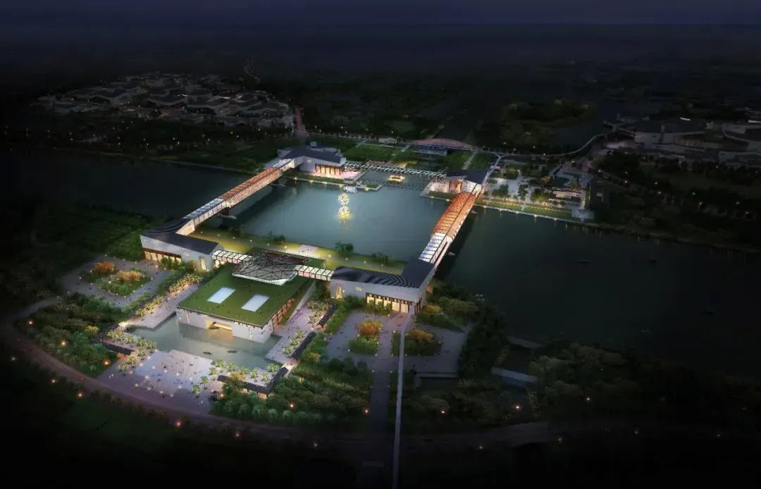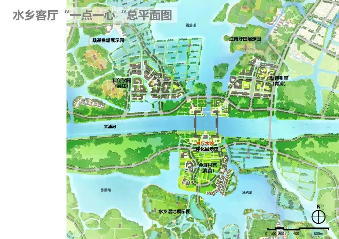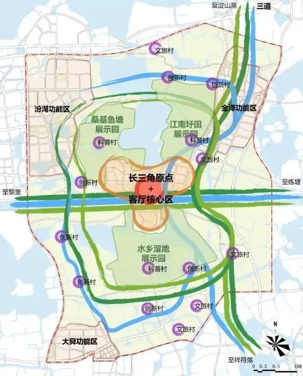 一是在空间结构上,水乡客厅构建“一点、一心、三园、三区、三道、多村”的空间结构,塑造江南韵、小镇味与现代风交融的新江南风貌,蓝绿空间占比约75%。“一点”即方厅水院,寓一体发展,充分挖掘长三角原点的独特内涵,围绕该地理标志打造一处可感知、可体验、可激发一体化认同的标志性功能场所。“一心”即临近长三角原点,是客厅核心区,包括创智引擎、科创学园和会展村苑三大组团,发挥“客厅”作用,布局建设多样的创新聚落空间。“三园”即江南圩田、桑基鱼塘、水乡湿地三个主题展示园,以湖荡圩田为基底,将现代绿色生态理念和技术与历史悠久的传统理水治水智慧文化相融合,打造运用湿地净化、水源涵养、循环农业、圩田再造等技术手段,形成有机融合的蓝绿空间和生态系统,打造世界级湖区的特色景观。“三区”即金泽、汾湖、大舜三大功能区,集创新聚落,以存量改造和择址新建相结合的方式,有机嵌入区域级、标志性的创新服务、文化创意、科教研发、生态体验等功能性项目,呈现面向未来的生产生活场景。“三道”即蓝道、绿道、风景道,链接水乡风景,通过水陆交通组织,串联自然地理和人文风景,打造以“锦绣江南、十里画廊”为建设目标的水乡客厅蓝环。“多村”即科普村、创新村、文旅村,促乡村振兴,通过功能提升、风貌整治、局部更新等策略,盘活并优化村庄建设用地,营造三生融合的水乡村落。