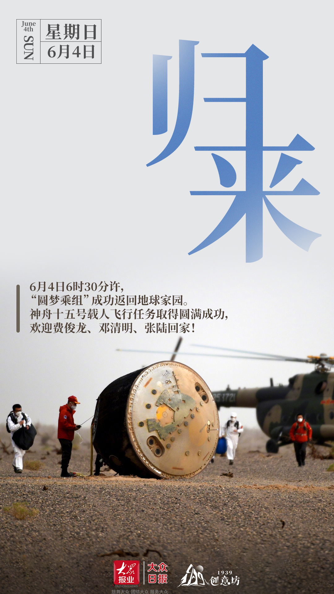 6月4日6时30分许,“圆梦乘组”成功返回地球家园。神舟十五号载人飞行任务取得圆满成功,欢迎费俊龙、邓清明、张陆回家!