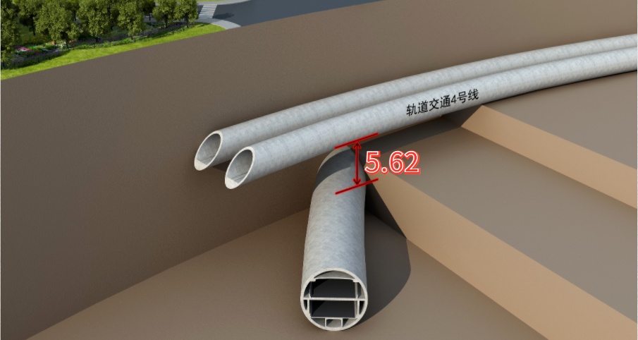 最小净距:“纵横号”盾构下穿轨道交通4号线,与轨道交通4号线隧道的最小垂直净距仅5.62米,不仅突破北横全线盾构穿越轨道交通的最小间距,为国内首次。在严峻的工况条件下,穿越中的轨道交通4号线最大沉降值仅为+7.87mm,严格的管理、精确的操控,确保了运营中轨道交通4号线的安全。