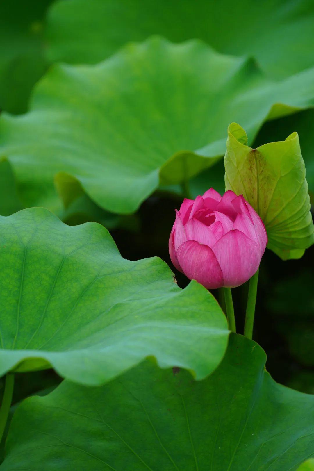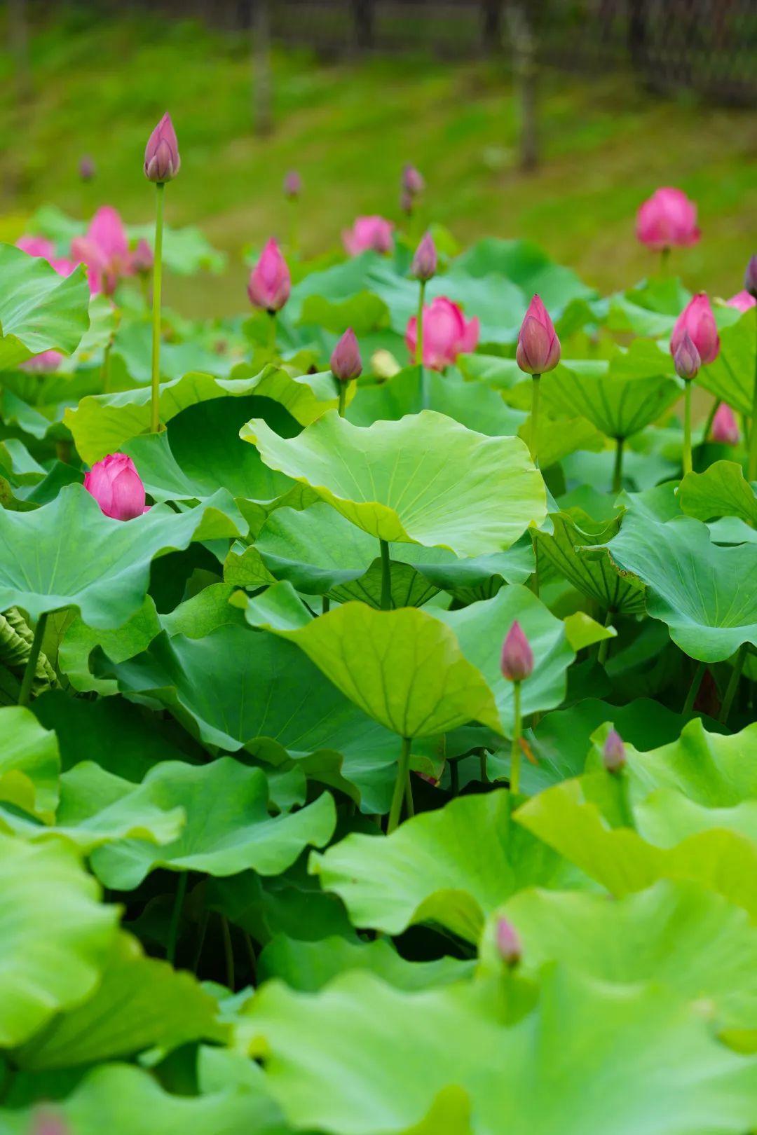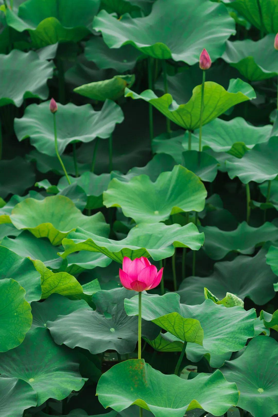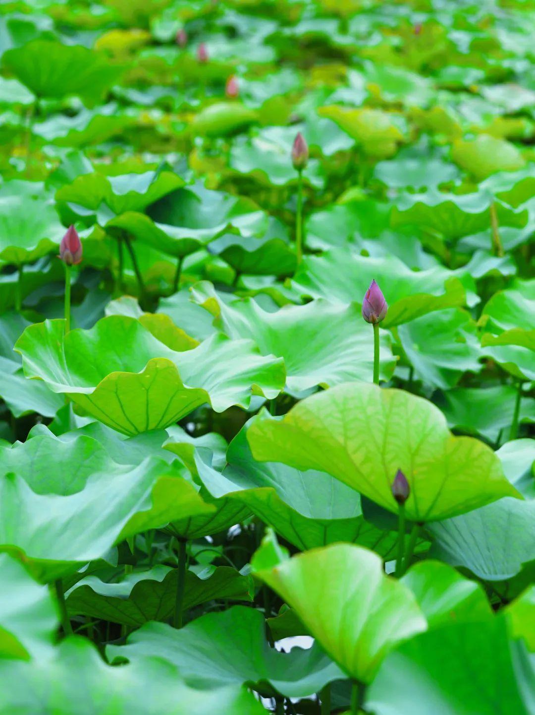 远观荷塘,一大片绿意覆盖湖面,满塘荷叶姿态各异,有像伞一样撑起的,也有像薄纱轻覆的,荷叶逢夏齐绿,荷花依次绽放,夏日清凉感十足!