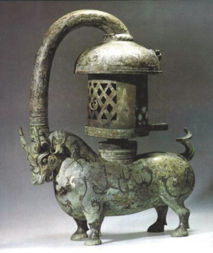 这座灯由三部分组装而成,下面是灯座,外表像一头俯首站立、双角上耸的黄牛;中间是牛背负的圆形灯盘、灯罩和灯盏;上方是烟道,由一根烟管直接通往下方黄牛的头部。