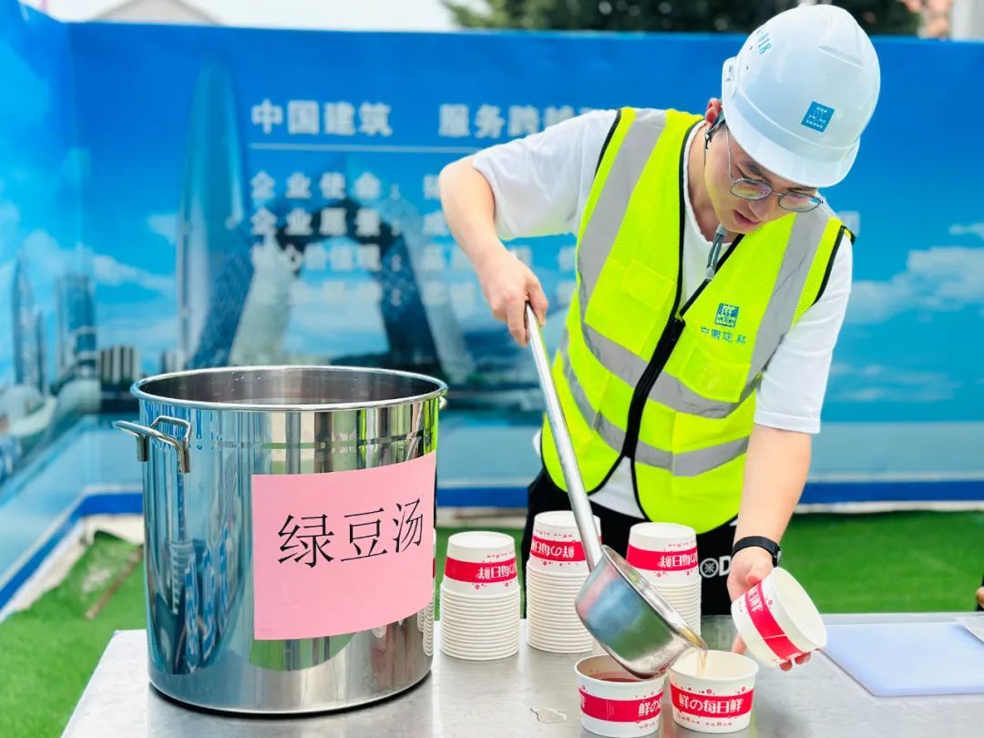 “最近太阳大、天气闷、温度高,你们在室外工作辛苦了,一定要做好防暑降温措施。”项目经理张雷一边说一边将手中的防暑物资依次送到工友的手中。他告诉记者,除了绿豆汤、西瓜等入口的食物外,他们还特意准备了藿香正气水、风油精、毛巾等。