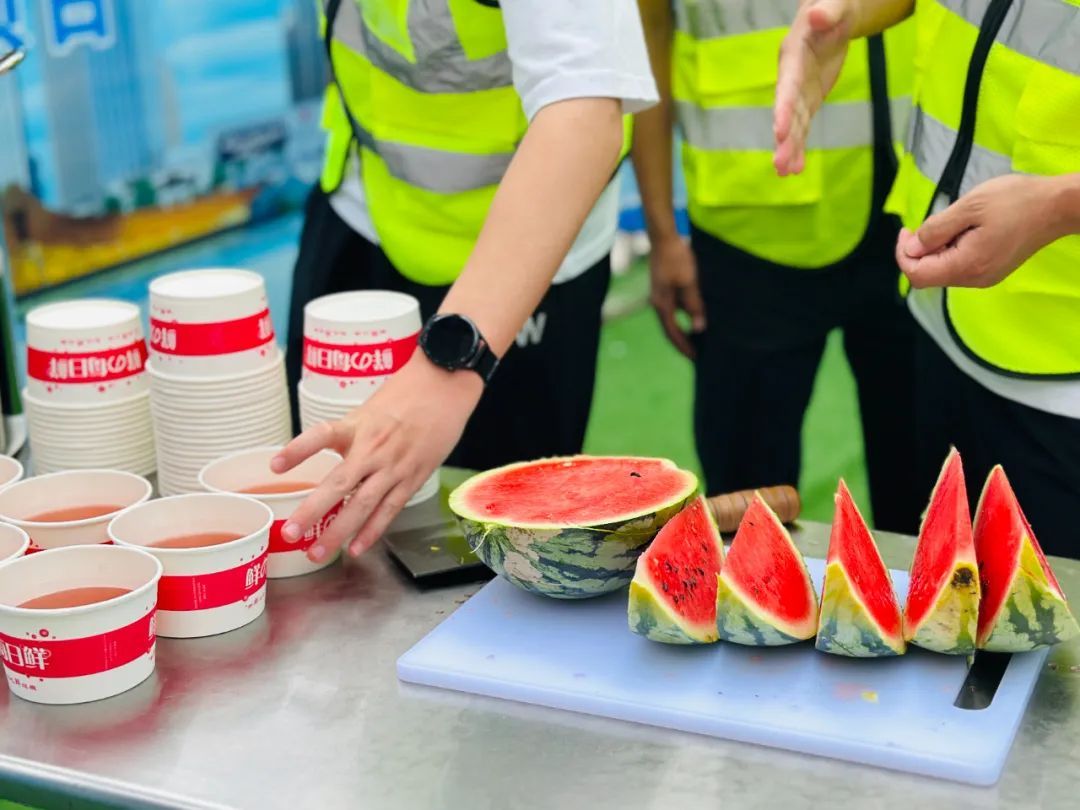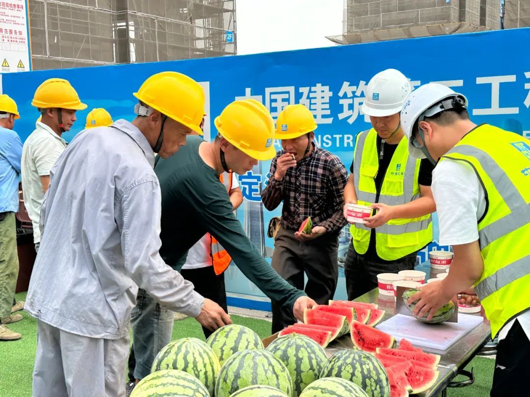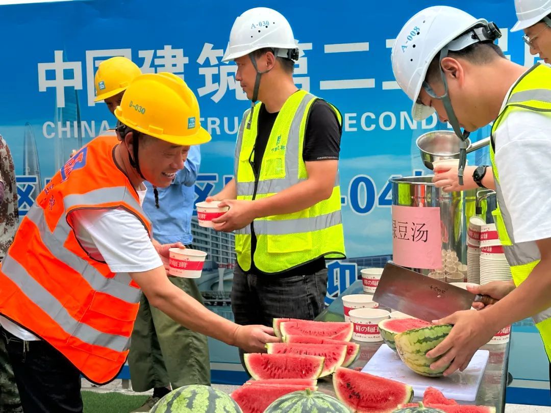 当天下午四点,中建二局的工作人员早早将新鲜的绿豆汤和西瓜准备好,在“防暑降温站”等待工人们休息时可以来到这里“充充电”。