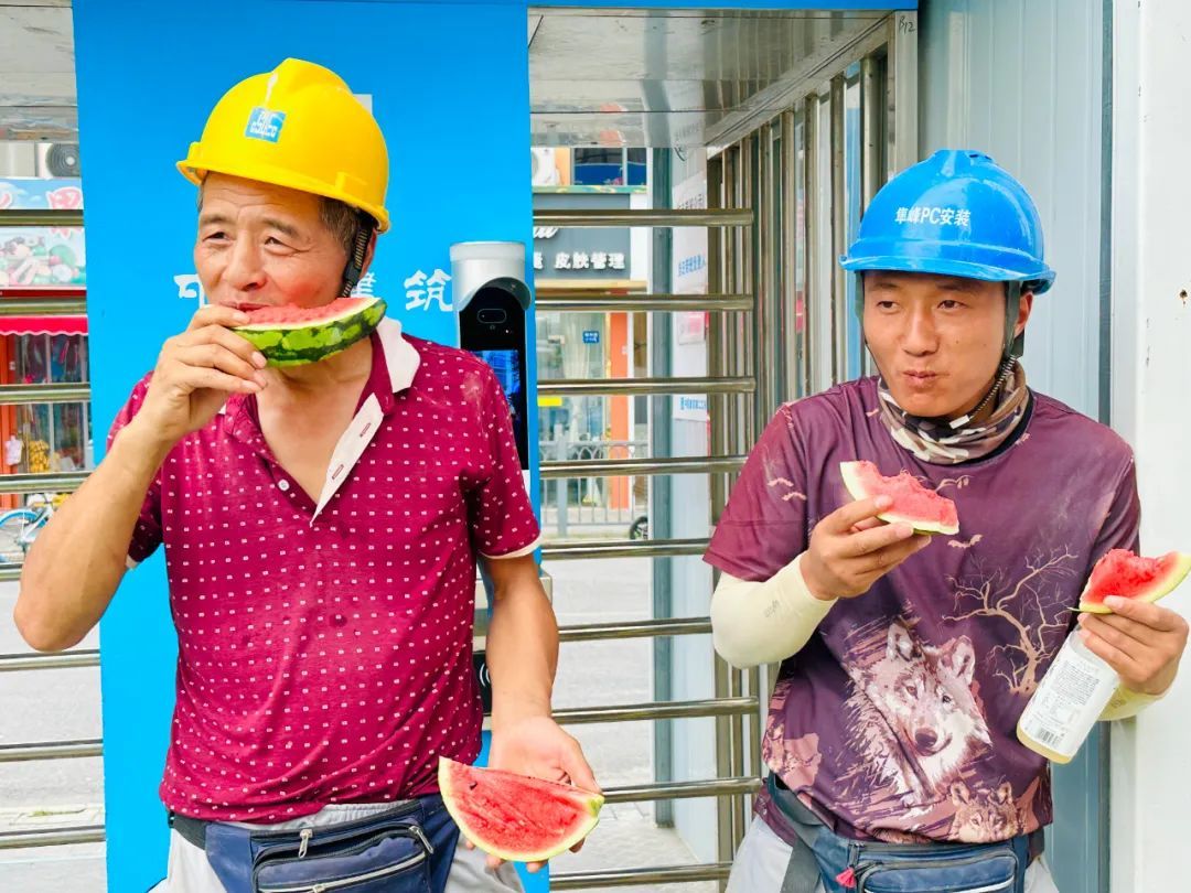 虽然工人们的皮肤大都被阳光晒得通红、脸上也淌着些许汗珠,但是在拿到绿豆汤和西瓜的那一刻,仍露出了开心满足的笑容。“工会对我们的暖心关怀让我有了一种回家的感觉,好像已经忘记了今天的劳累。”木工张四年说。一旁的工友文莲也激动地表示,“虽然绿豆汤和西瓜都是给我们解暑用的,但是我的心里却暖暖的。”