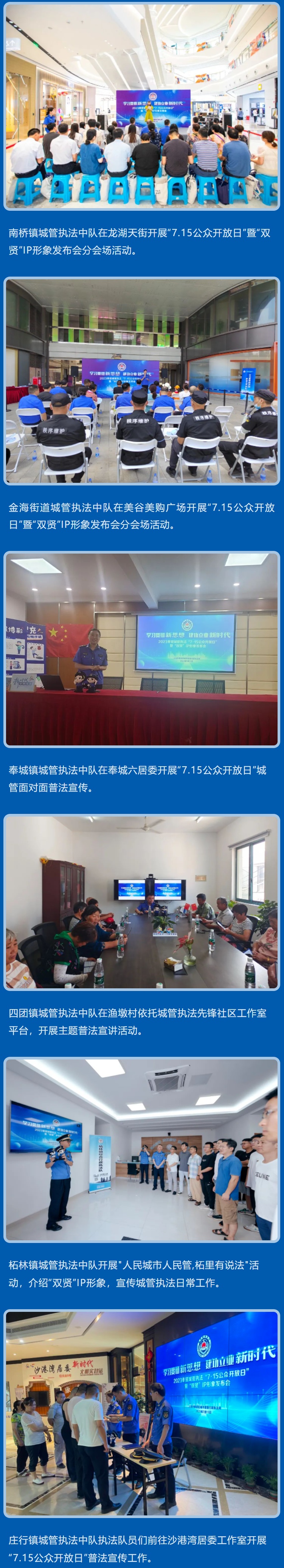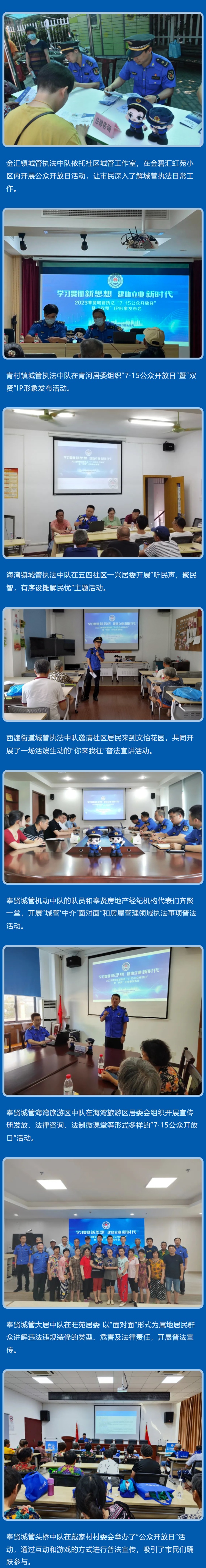全区其他各基层城管执法中队也积极依托“7·15公众开放日”契机 ,同日全面开展形式多样的普法宣传活动、坚持“请进来”和“走出去”相结合,“线上”与“线下”齐发力,进一步加强与市民群众的互动交流,不断拉近城管执法部门与市民群众的距离,提升城管执法工作社会知晓度,为打造新时代人民城市新典范凝聚强大合力。