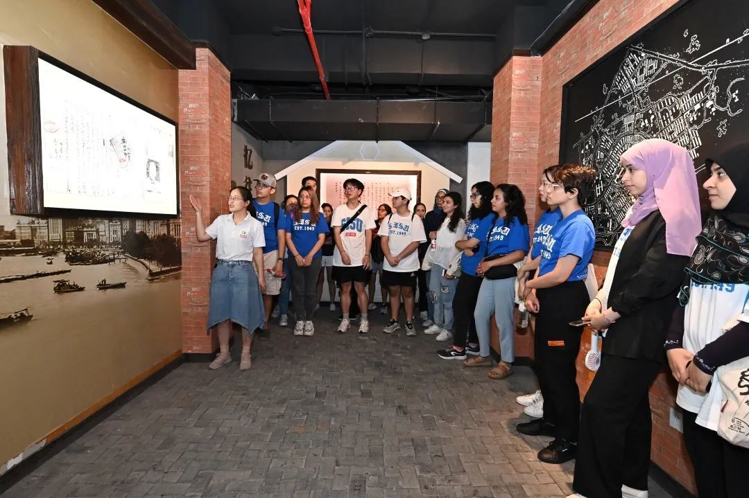 在曹杨新村村史馆,外国留学生们跟随着讲解员的脚步,一起探寻曹杨新村的故事。在实物展厅内,一张张老照片、一件件老物件让这些远道而来的外国留学生们感受到了曹杨新村的风土人情和历史变迁。他们对这里的发展和居民的生活表现出浓厚的兴趣,也十分好奇这里的故事。讲解员用流利的英语向他们介绍了曹杨新村的由来、建设、改造和未来规划,还向他们展示了一些曹杨新村的特色文化活动,大家还饶有兴致地观看了微电影《心动曹杨》,更加深入直观地了解了“做一天曹杨人”。在场的留学生们纷纷举起手中的相机,记录下这美好的时刻。