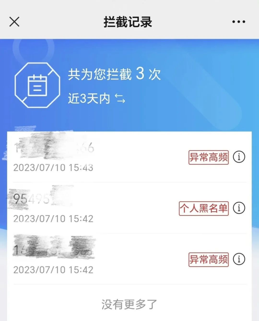 最近才开通中国移动防骚扰电话功能的张女士表示,这几天电话清净多了。她展示的拦截页面显示,一天内系统就成功拦截3通骚扰电话。对于拦截原因系统也做出了清晰标注:两个因异常高频被拦截,另外一个因黑名单被拦截。