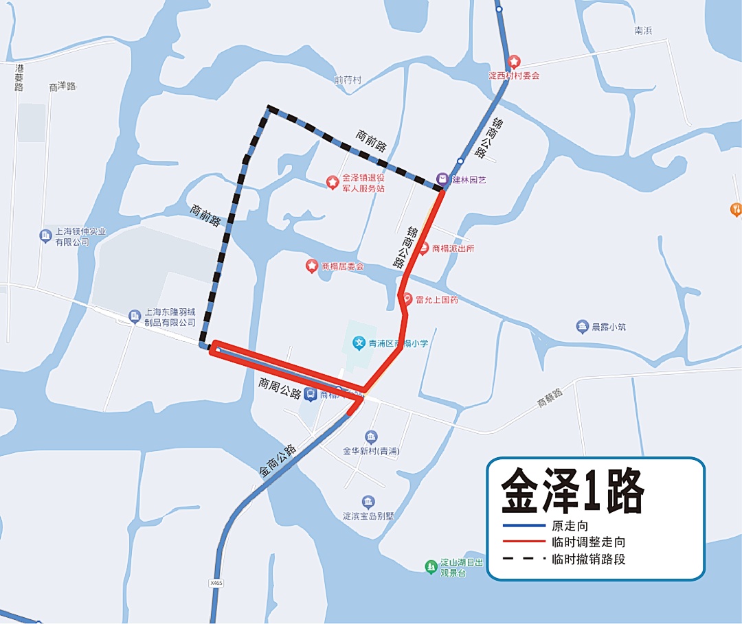 因金泽镇商前路(锦商公路-商周公路)即将进行施工,青浦区建管委计划于8月3日起临时调整金泽1路走向及站点,具体如下: ◀ 金泽1路 ▶ 调整时间 2023年8月3日首班车起。 走向及站点调整 原走向:上行自锦商公路淀西村起经锦商公路、商前路、商周公路、金商公路、陈新路、官字圩路、陈新路、雪米路、金商公路、沪青平公路、金溪路、培育路、金大路、金湖路至金湖路徐李村止;下行自循原路返回。 临时调整为:上行自锦商公路淀西村起经锦商公路、商周公路(至商前路折返)、金商公路、陈新路、官字圩路、陈新路、雪米路、金商公路、沪青平公路、金溪路、培育路、金大路、金湖路至金湖路徐李村止;下行自循原路返回。 临时撤消站点:商前路张家浜村(双向)、商前路前行村(双向)、商前路桥头港村(双向)。 ◀ 金泽1路调整后走向 ▶ 我委将根据道路施工情况及时恢复原线路走向,为此给广大乘客带来不便敬请谅解并请相互转告! 特此通告。 青浦区建设和管理委员会 2023年7月28日