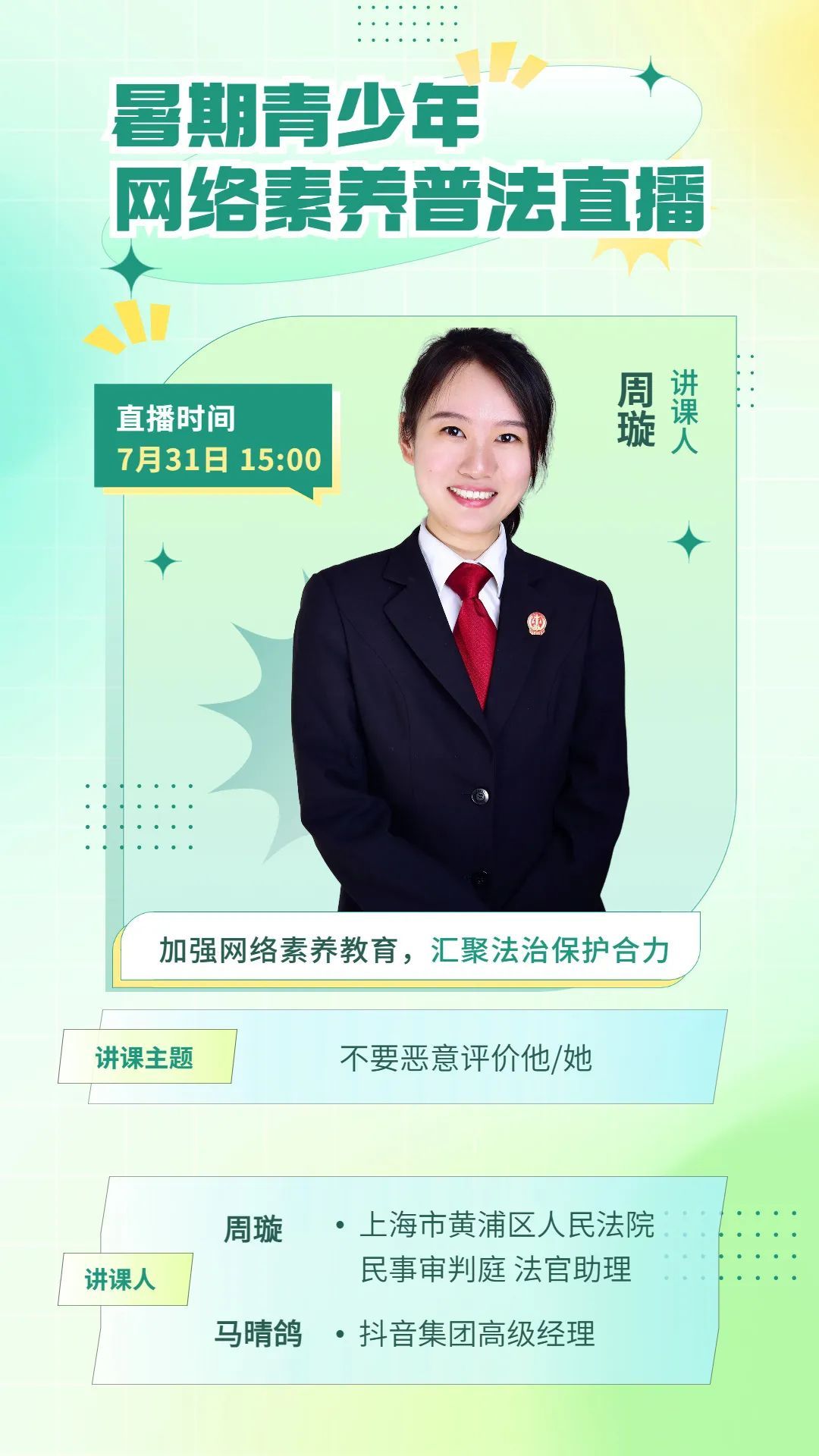 2023年7月31日,上海市黄浦区人民法院将联合上海市黄浦区南京东路街道承兴居委为家长、青少年们带来主题为《暑期青少年网络素养普法——不要恶意评价他/她》普法课。