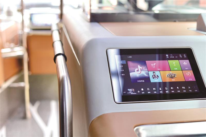 据介绍,登上热搜的乐游3号线,是我市精心打造的展示太湖明珠魅力的“流动窗口”——双层巴士特色旅游观光线路之一,周一至周日开行,从无锡中央车站到跨塘桥,共7个站点。为契合旅游城市形象,双层巴士不仅有炫彩的外观,全景天窗版的车辆内部更是配备了KTV音响、无线充电等设施(如图),让游客在乘坐游玩的途中,随时可以高歌一首,享受不一样的旅程。