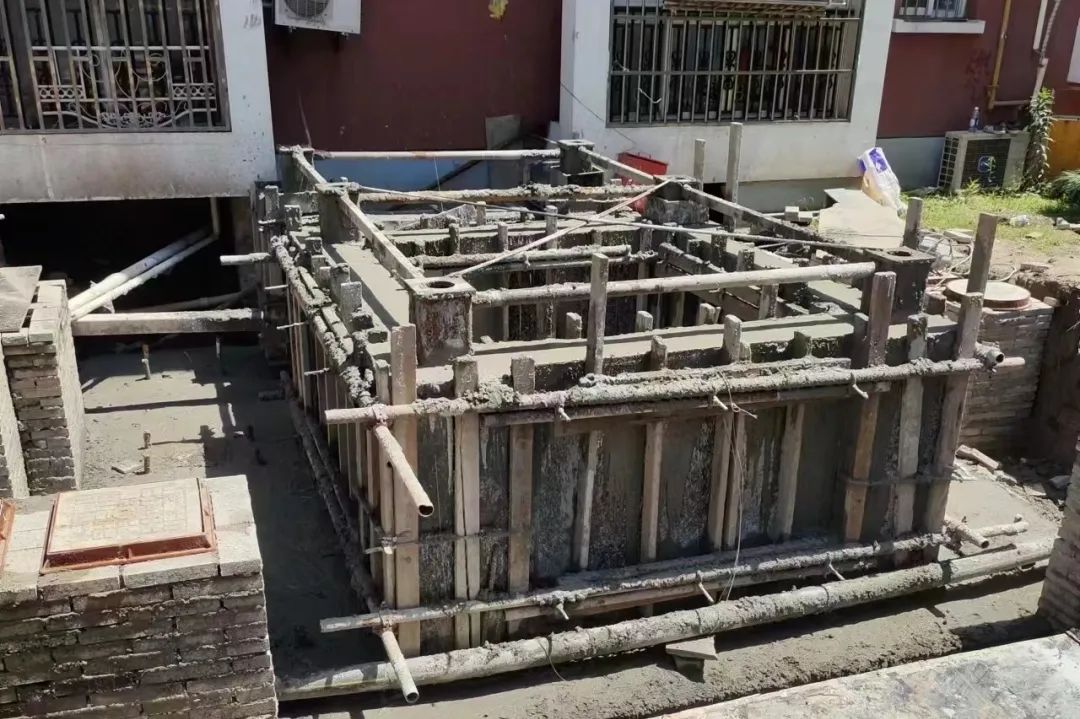 管线迁移就如开“盲盒”,景江苑的两台电梯基坑开挖后发现原有管线很复杂,电力、煤气、自来水、电信等管线“应有尽有”,大部分管线按照要求完成迁移,唯独在自来水管线迁移过程中碰到了难题。为了顺利推进现场施工,街道要求代建企业暂缓工程,并紧急协调浦东威立雅自来水公司,加梯办、居委会、业委会一起群策群力,与自来水公司商讨确定解决方案,最终顺利将“盲盒”中的所有管线迁移完成。