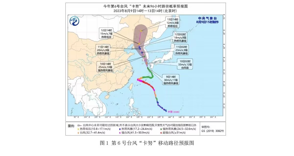 山东省气象台8月9日16时20分发布台风蓝色预警:今年第6号台风“卡努”的中心9日14时位于日本九州鹿儿岛偏西方向约165公里的东海北部海面上,中心附近最大风力为11级(30米/秒,强热带风暴级),中心最低气压为970百帕。预计,“卡努”将以每小时15~20公里的速度向北偏西方向移动,将于10日上午在朝鲜半岛南部沿海登陆,登陆后继续北上,强度逐渐减弱,11日夜间进入我国东北地区。