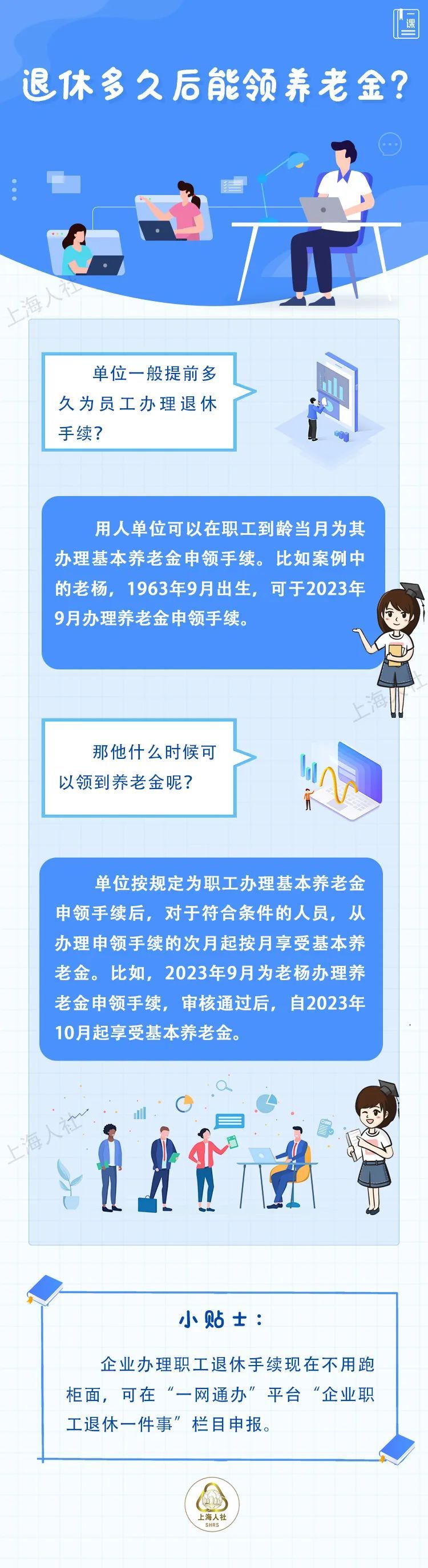 老杨下个月就将满60周岁,愉快的退休生活即将开启。最近他碰到HR小梅,询问她公司什么时候为他办理退休手续,他大概什么时候能拿到养老金。小梅有些支支吾吾答不清楚。那员工即将到龄退休,什么时候为他办理退休手续,他又从何时开始领养老金呢?