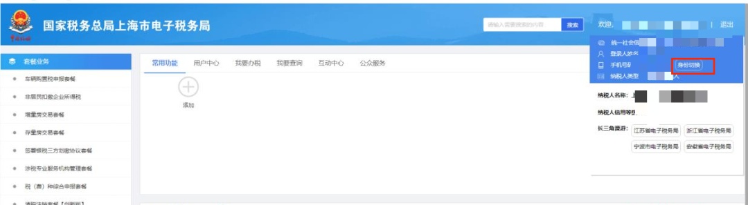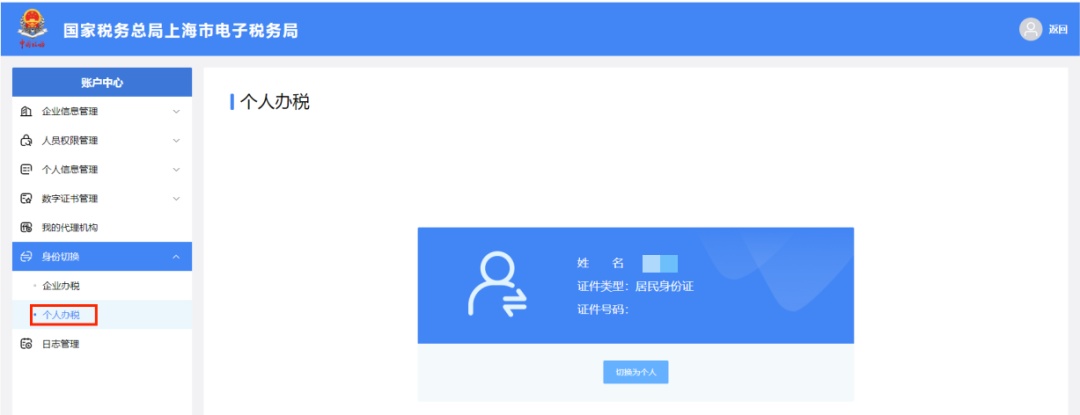答:使用上海市电子税务局“企业业务”登录后,点击【账户中心】—【身份切换】—【个人办税】,可以看到办税人姓名、证件类型、证件号码,点击【切换为个人】即可切换到上海市电子税务局“自然人业务”界面。
