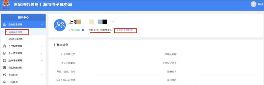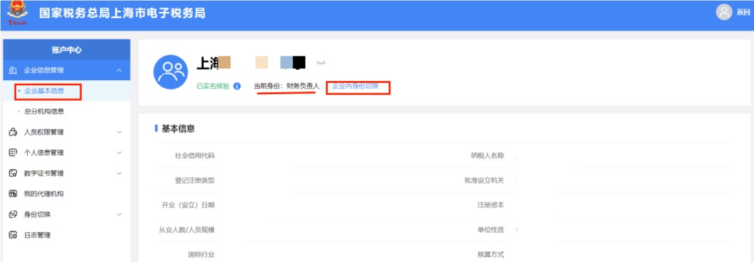 使用上海市电子税务局“企业业务”登录后,点击【账户中心】—【企业信息管理】—【企业基本信息】,可以查看企业当前身份。