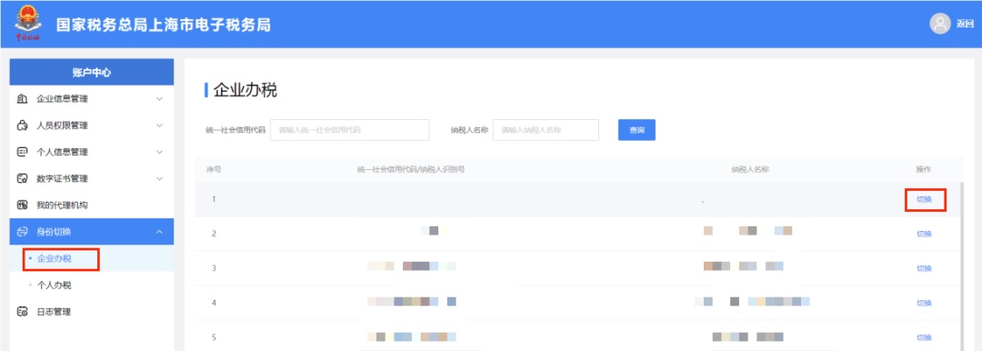 答:使用上海市电子税务局“企业业务”登录后,点击【账户中心】—【身份切换】—【企业办税】,可以查询可切换的关联企业,选择需要切换的企业,点击【切换】即可快速切换企业。
