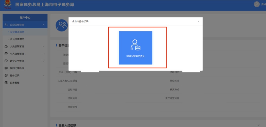 如果要切换身份,点击【企业内身份切换】—点击【切换为法人/财务负责人/办税员】即可快速切换不同身份。