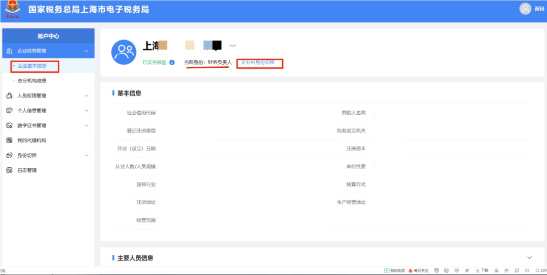 使用上海市电子税务局“企业业务”登录后,点击右上角企业名称,点击【身份切换】—【企业信息管理】—【企业基本信息】,可以查看企业当前身份。