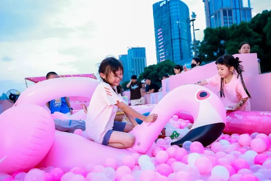 作为此次活动的亮点,数百平的粉色沙滩被“搬”到了现场,不用远离家门,市民就可以漫步在粉色沙滩,感受夏季的无限美好。在沙滩营地区域,遮阳伞、沙滩椅、泡泡泳池成为游客的打卡地。