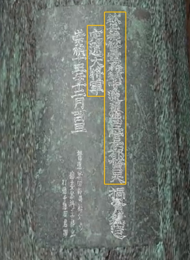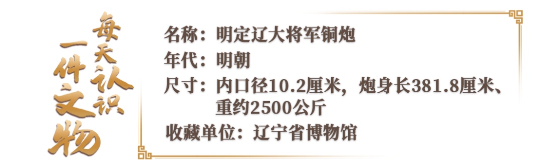 “钦差提督军务镇守辽东总兵官左都督吴捐资铸造,定辽大将军,崇祯十五年十二月吉旦,督造掌印都司孙如激,总委参将王邦文,打造千总石君显。”