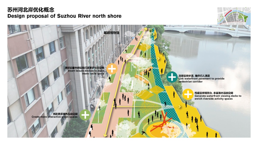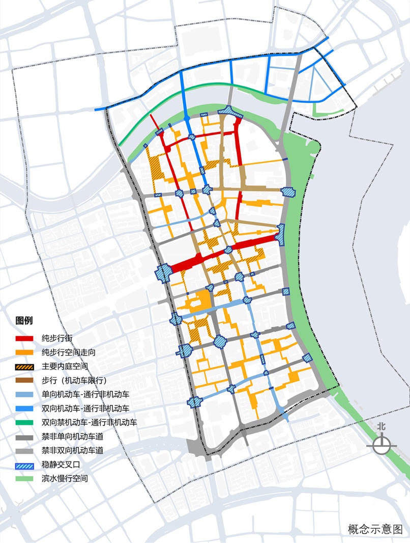 黄浦外滩更新单元以人行环境最优为目标,通过优化苏州河两岸滨水空间、梳理整合区域交通体系、形成“大街串小巷”的沉浸式步行廊道,打造街道可漫步、建筑可阅读的高品质活力街区。