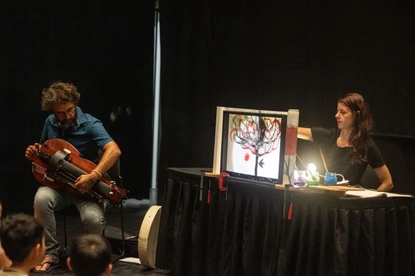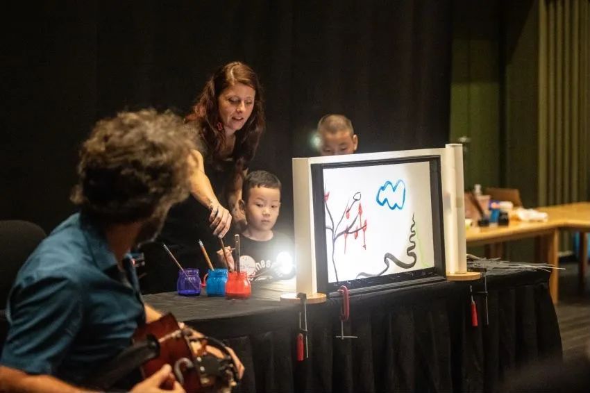 孩子们轮流上场,配合着画轴上徐徐展开的、自己创作的森林写意画,讲述“庄周梦蝶”的中华传统故事。一旁,音乐家用一种古老的乐器——手摇琴进行现场配乐。多彩质朴的笔触和悠扬悦耳的音乐,展示童真与幻想,让听者慢慢回忆起自己幼年时期的一个个童话美梦……