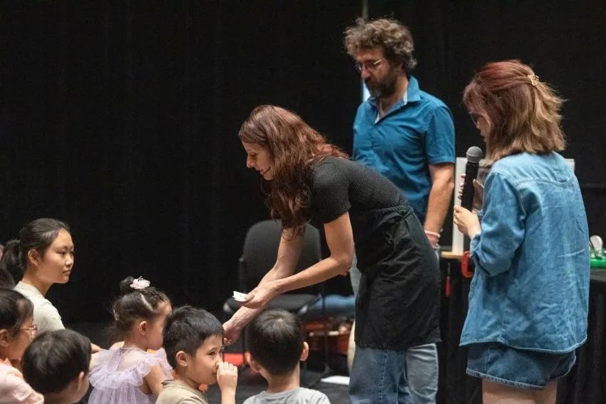 当天,报名参与的小读者们被分为两组,在法国的视觉艺术家、多媒体创作者、绘本画家雪莉· 弗罗伊登赖希(Sherley Freudenreich)和音乐家弗雷德里克·霍尔维克(Frédéric Holweck)的引导下,分别绘制自然与森林主题的卷轴画,并裁剪蝴蝶与飞鸟画像,进行手工创作。