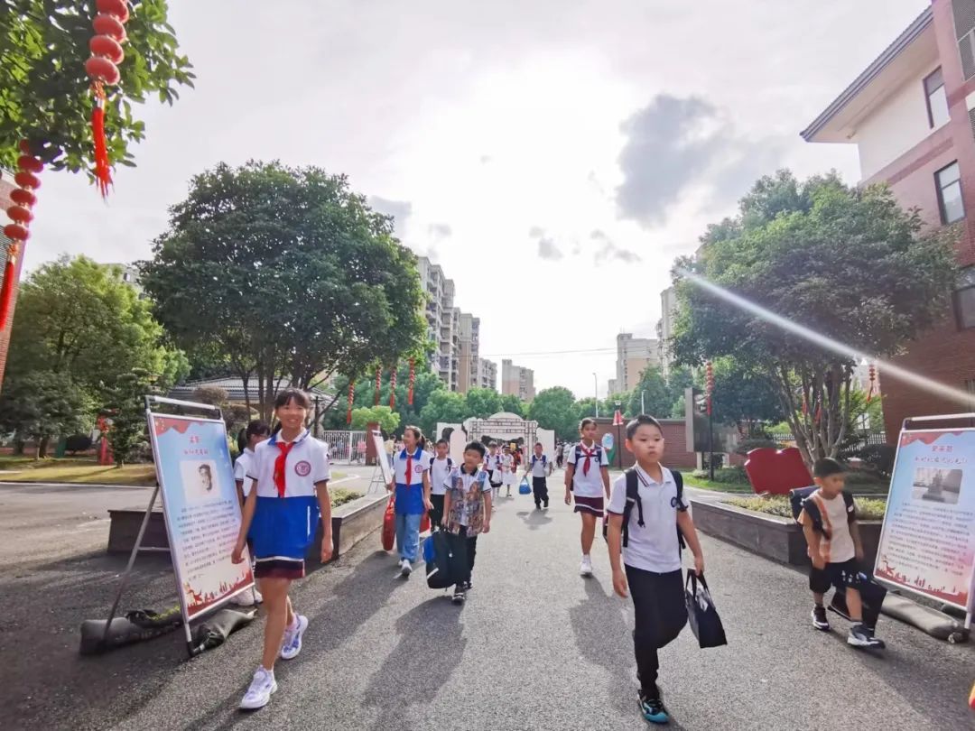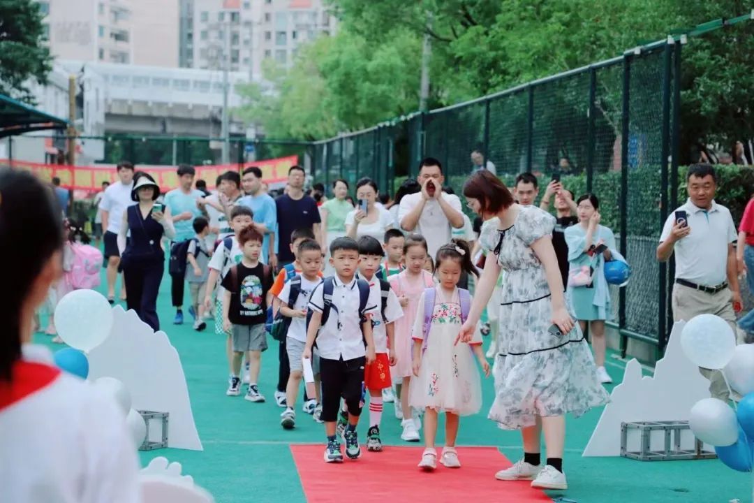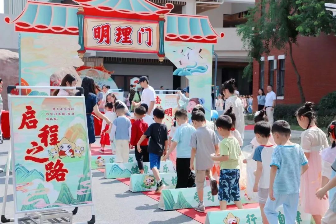 在今年刚挂牌的九里亭外国语实验学校,一进校,孩子们跨过贴满各式祝福的跨栏,从“启程之路”直通“明理门”,拾起系有红绸布的鼓槌,“咚咚咚”的鼓声震彻校园,“爱学习、勤努力、明志向”的目标便在心里生了根。