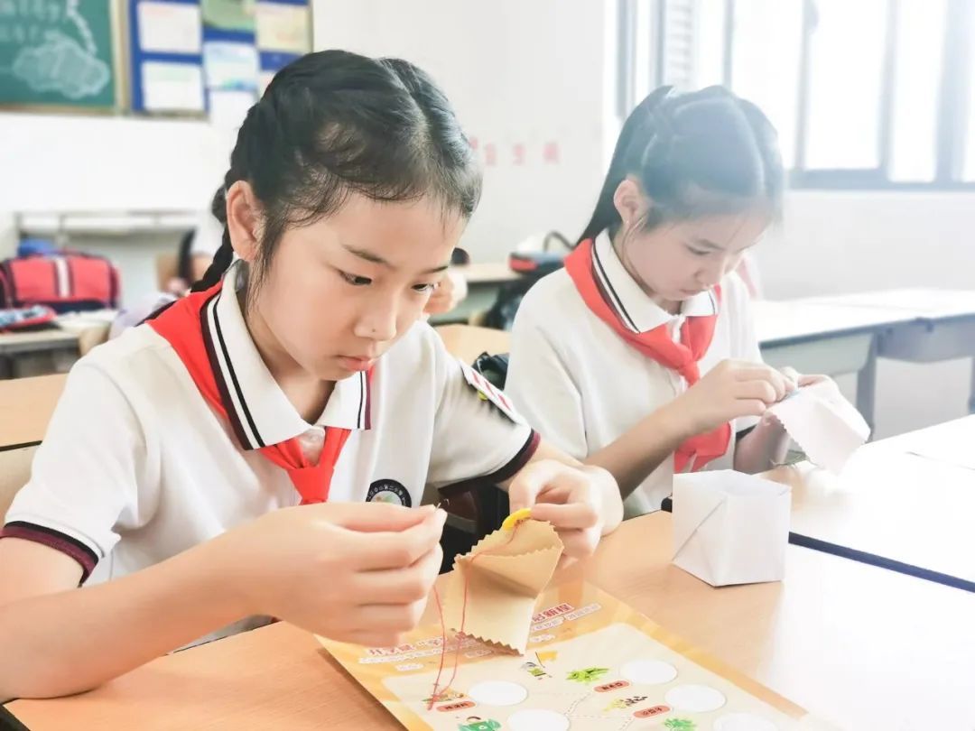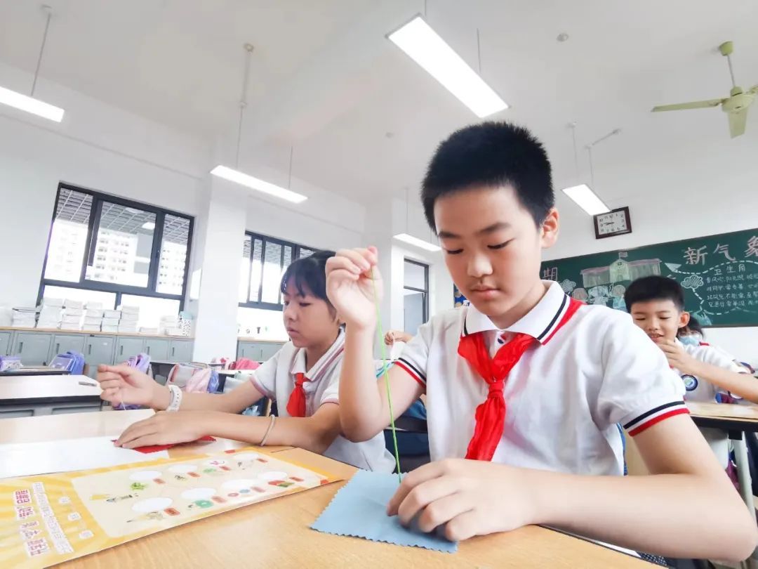 在缝纽扣“考场”,孩子们穿针引线,尝试将一颗颗纽扣缝在方形彩布上。五(6)班学生高亦涵看起来轻车驾熟,原来,喜欢做手工的他很早之前就学习过针线活了。第一次挑战缝纽扣,五(6)班詹李晗感到有点受挫:“蛮难的,线太长了容易打结,回家以后得向奶奶好好请教一下。”