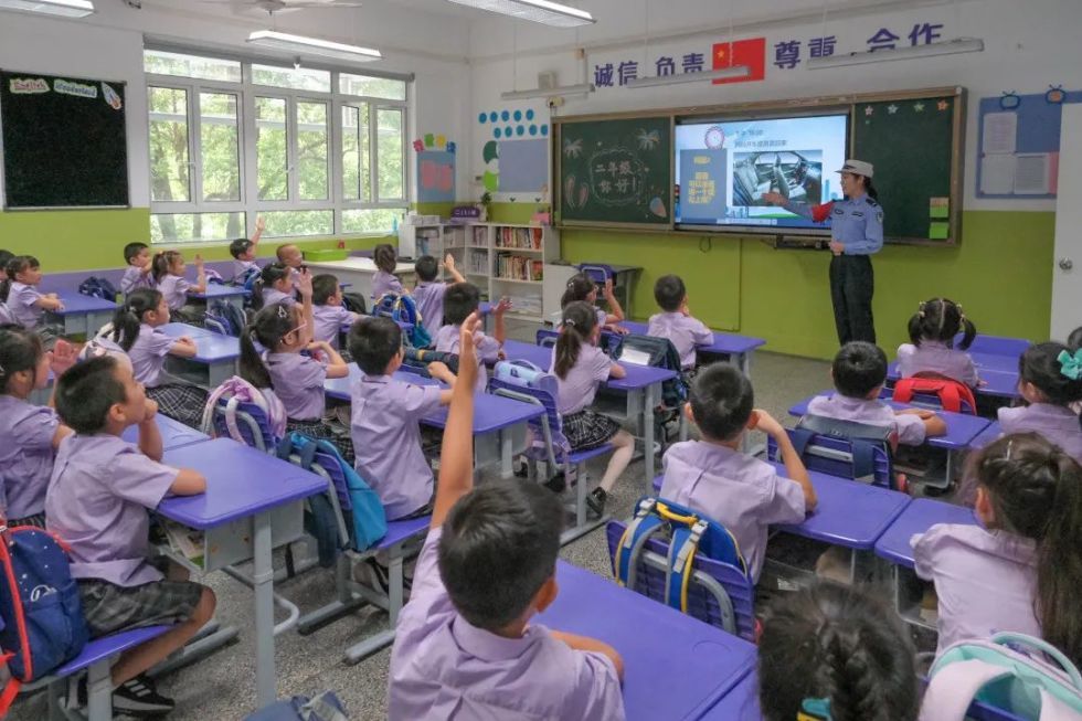 入校完毕,来自浦东公安分局交警支队一大队世纪大道女警中队的民警朱菱为学生们送上交通安全“开学第一课”。课堂上,朱菱在互动中传递着交通安全知识,在潜移默化中提升孩子们的交通安全意识。据悉,此次福山正达外国语小学共有新生220余名,他们都将在校内学习到交通安全知识等相关内容。