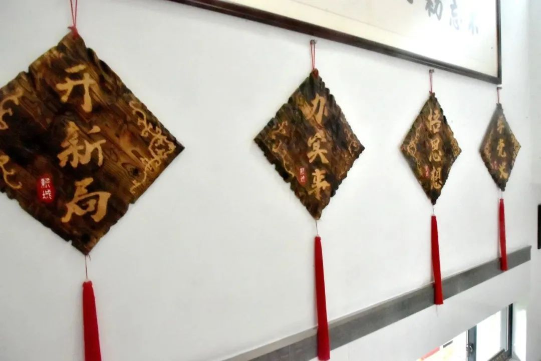 标牌,刻有“开新局”“办实事”“学党史”“悟思想”字样,这些标牌是消防队员通过火刻工艺制作的。