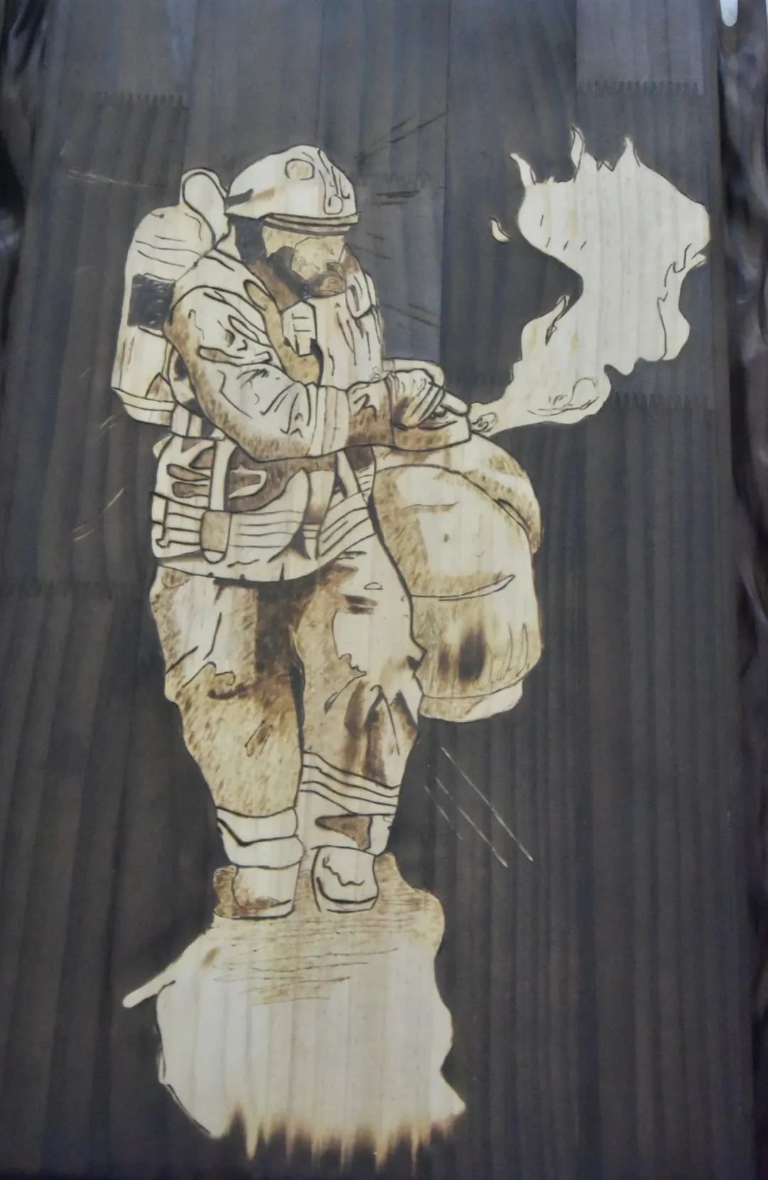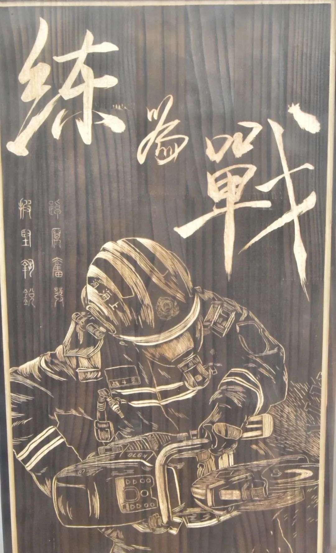随着队员们火刻技术的逐渐娴熟,除了火刻标牌,今年,大家又进行了一些新的尝试,将消防站生活中的一些感动点滴以及出警救援过程中的一些感人画面,利用木板火刻呈现出来。