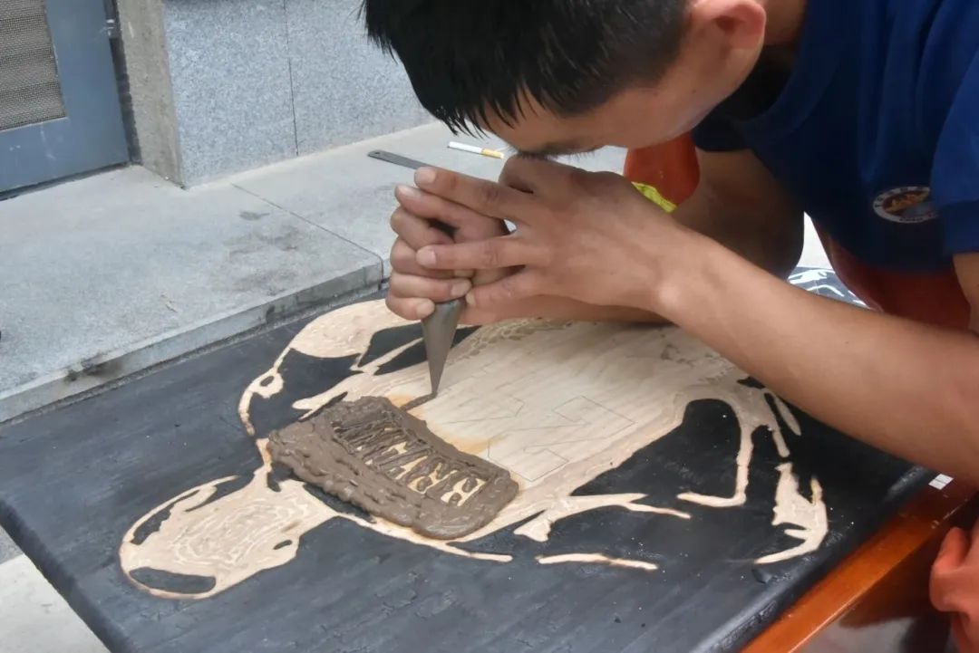 几人的想法一下子得到了站里的支持,大家买来了木材、陶土,准备圆锯、角磨机、喷火枪等一些工具。铅笔在木板上勾勒上文字,将陶土和泥土混合压实在文字上,喷火枪沿文字烧烤木板……队员们利用休息时间学习网上火刻工艺的技术步骤,尝试火刻作品。