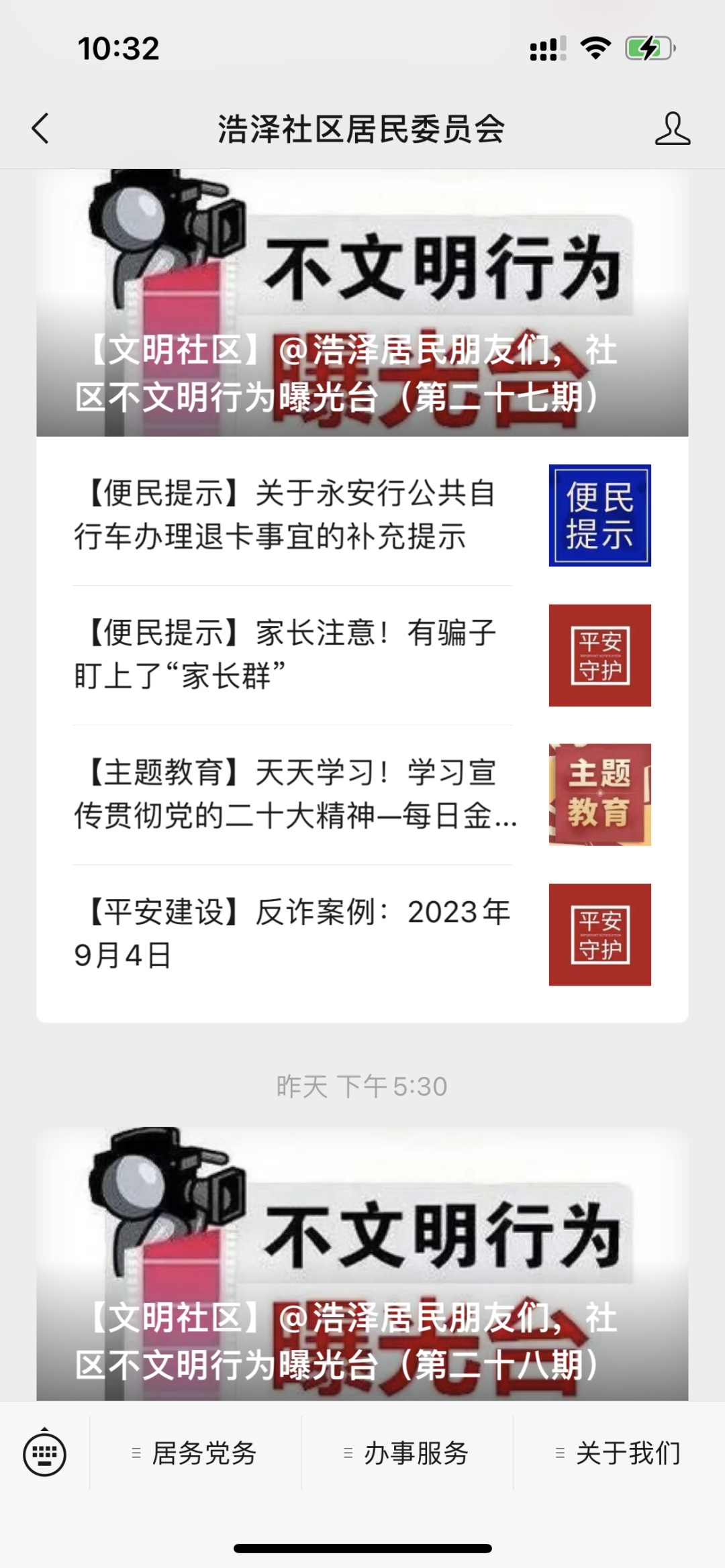 浩泽社区在微信公众号开设“不文明曝光台”专栏,每日发布不文明现象;在楼道宣传栏曝光不文明行为,形成“线上+线下”双曝光制度,引起居民群众共鸣。浩泽居民区党支部书记庄军表示,通过每日曝光社区不文明行为,一方面是让更多居民群众参与监督、引以为戒,另一方面是为了不断提高广大居民群众讲文明、守秩序的意识,自觉摒弃不文明陋习。