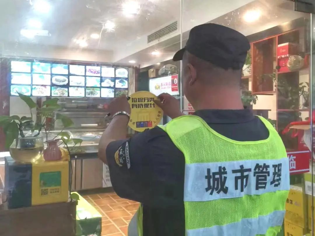 “我们扫街组对分类投放容器设置不规范、分类投放不精准等存在违规的商户,张贴黄牌,在后续检查中提高检查频次,整改完毕复查合规的,即可揭去黄牌。对发现拒不整改、严重违规或多次发生违规情况的商户,张贴红牌,移交综合执法队跟进执法,并在后期进行重点复查。对符合分类标准的商铺作为达标商铺,即视为获得绿牌。”盈浦街道综合行政执法队队长王赟说道。