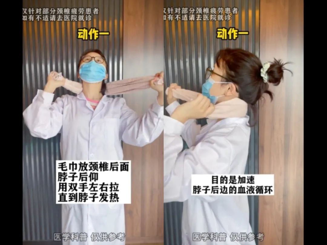 毛巾放在颈椎后面,脖子后仰,用双手左右拉,直到脖子发热。目的是加速脖子后面的血液循环。