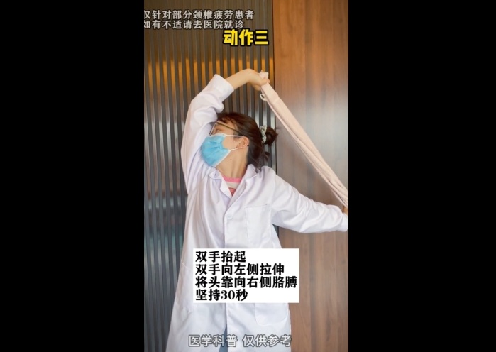 双手抬起,向左侧拉伸,将头靠向右侧胳膊,坚持30秒。复位,再向右拉伸,头靠向左侧,坚持30秒。