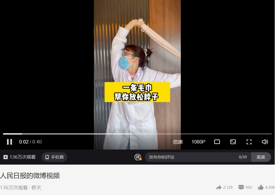 近日,人民日报发布了《一条毛巾帮你放松脖子》小视频,引起了网友的共鸣和点赞,短时间内就有超100万次观看。