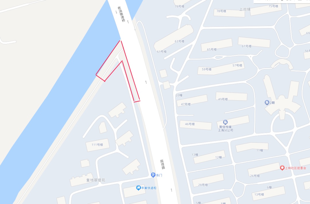 口袋公园东临辰塔路老油墩港桥上桥路段,北侧为油墩港,东临辰塔路老油墩港桥上桥路段,北侧为油墩港。