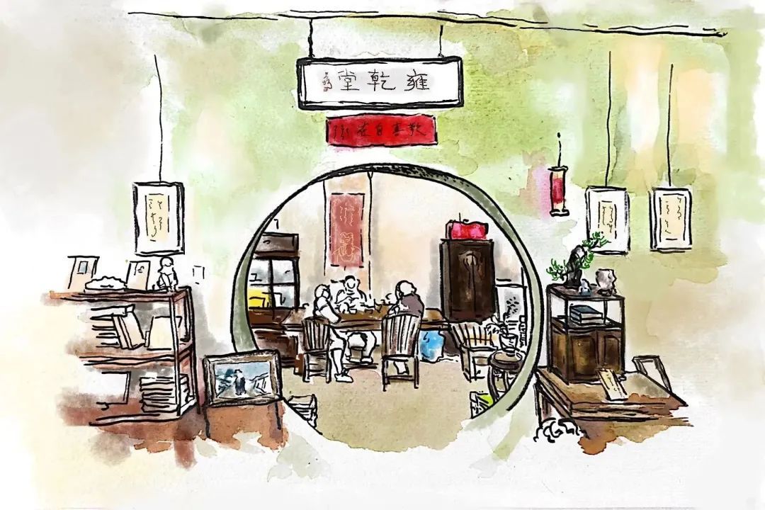 设计颇具古韵的大门,大方敞开没有遮挡。来者皆是客,聊几句天,坐下来喝上一盅茶。一个晚上的时间就一溜烟地划过去了。