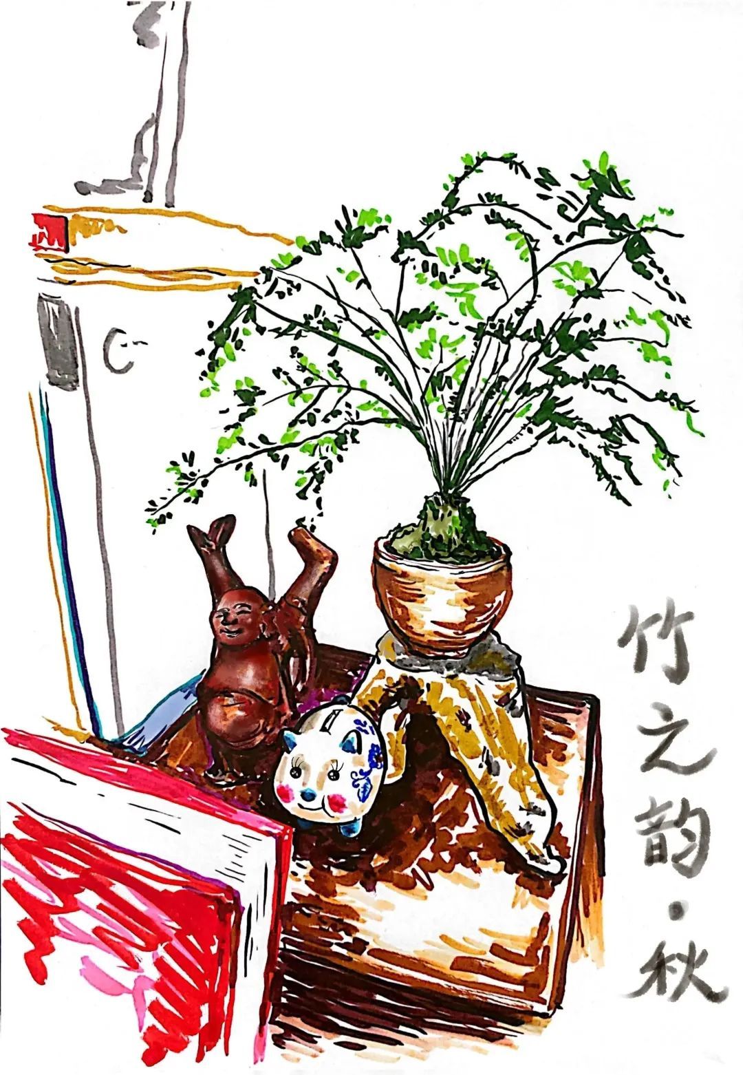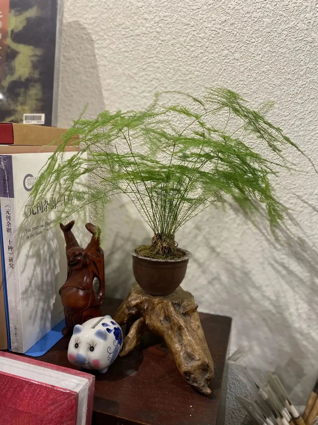 清丽的文竹盆景,笑眯眯的弥勒佛和憨态可掬的小猪储蓄罐给爱书人带去了一瞬间的欢乐。