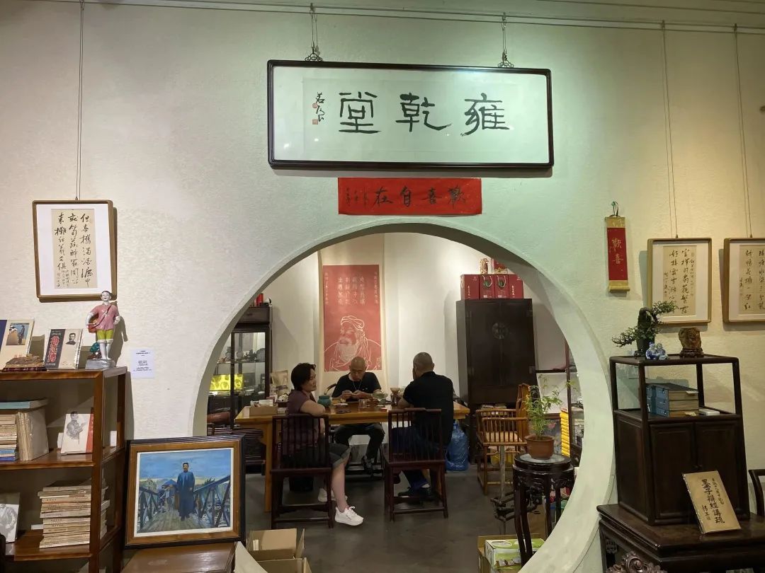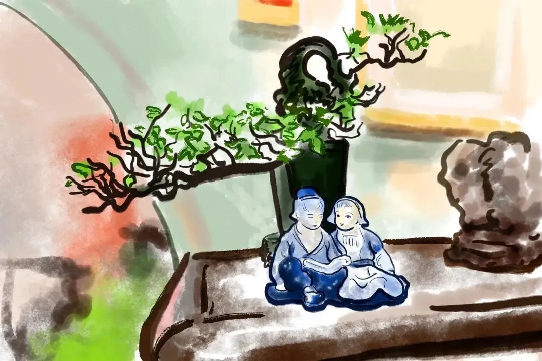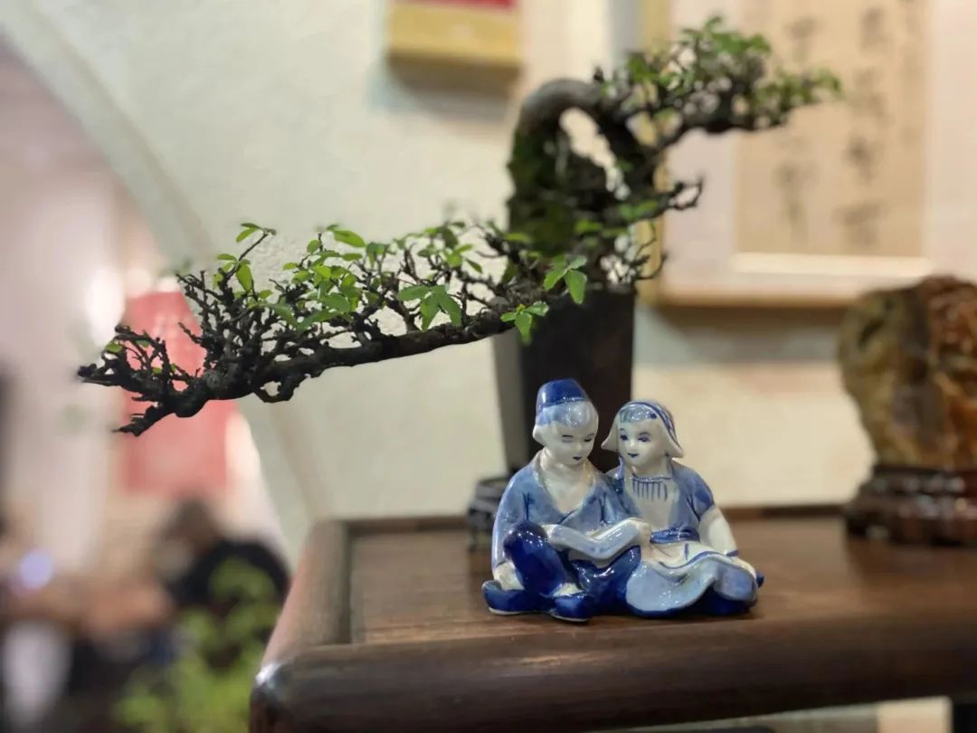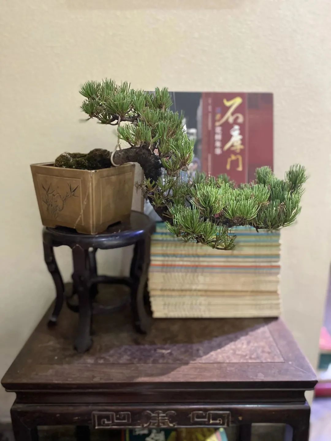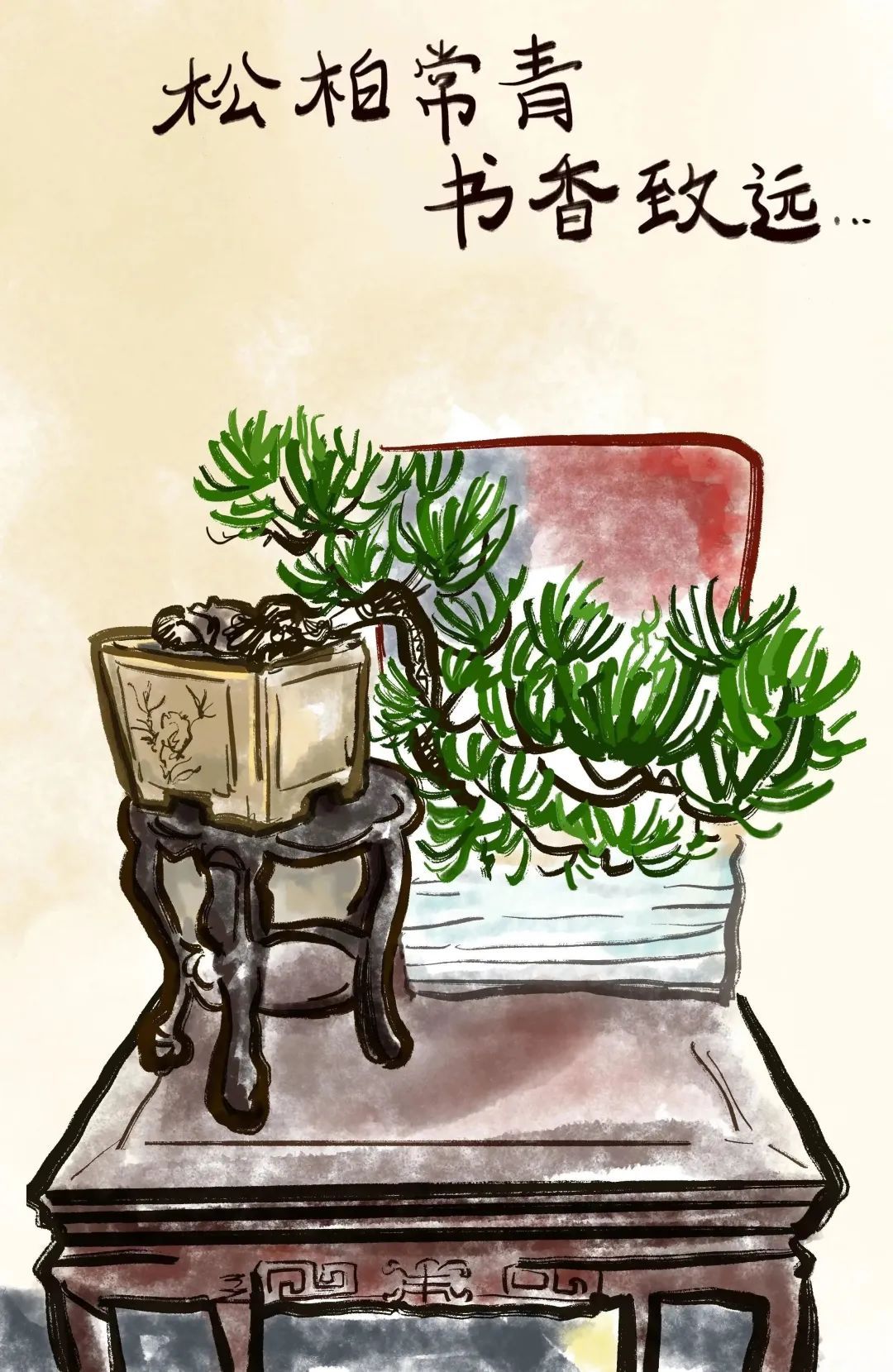 小小的盆景松条和旧红木桌几,随处可见的书册被摆出了苏州园林的味道。