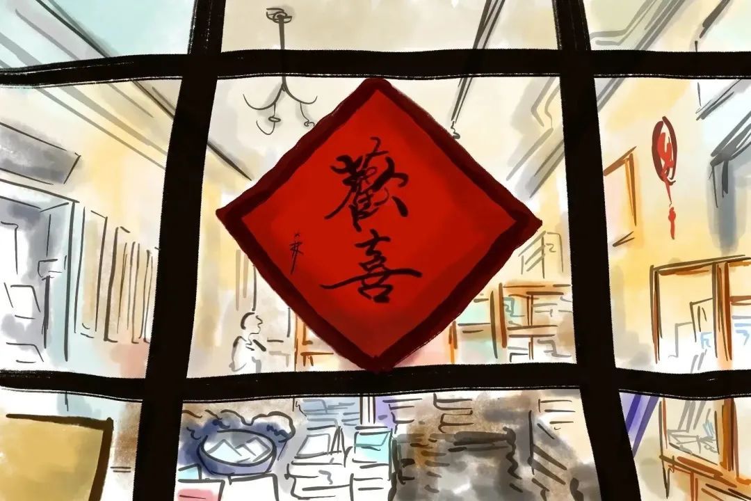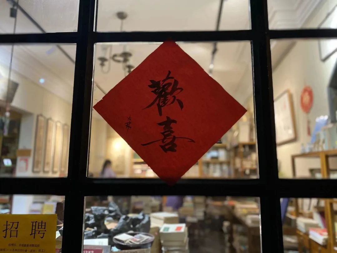 店外玻璃窗上贴的红纸,“欢喜”这两个字不仅是爱书人对知识的态度,也是我们每个人对生活最好的向往。